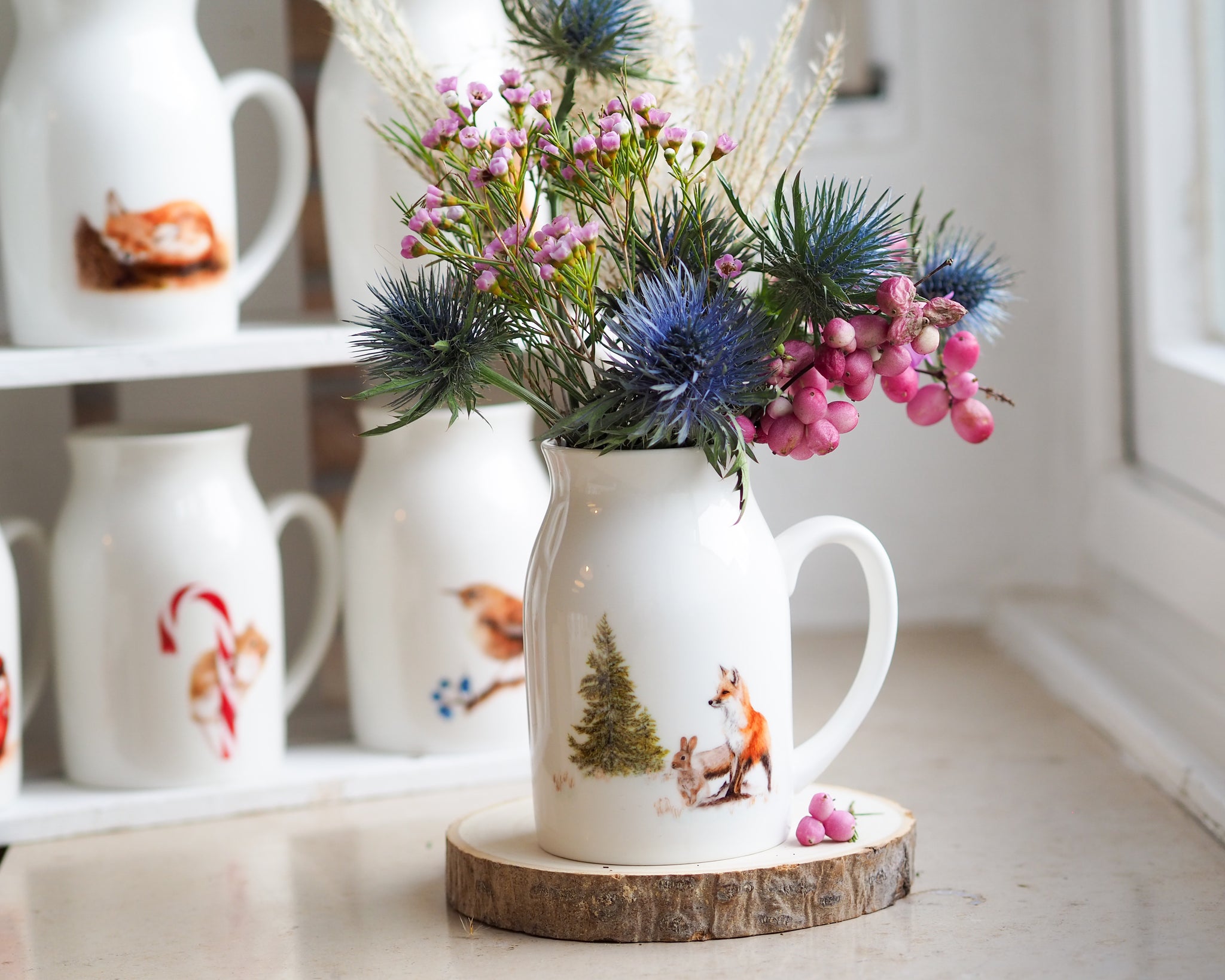 Weihnachtliches Keramik-Milchkännchen mit zartem Naturmotiv, feiner Druck in warmen Farben Fuchs und Hase
