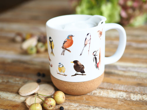 Große Tasse mit Korkboden "Liebste Gartenvögel"