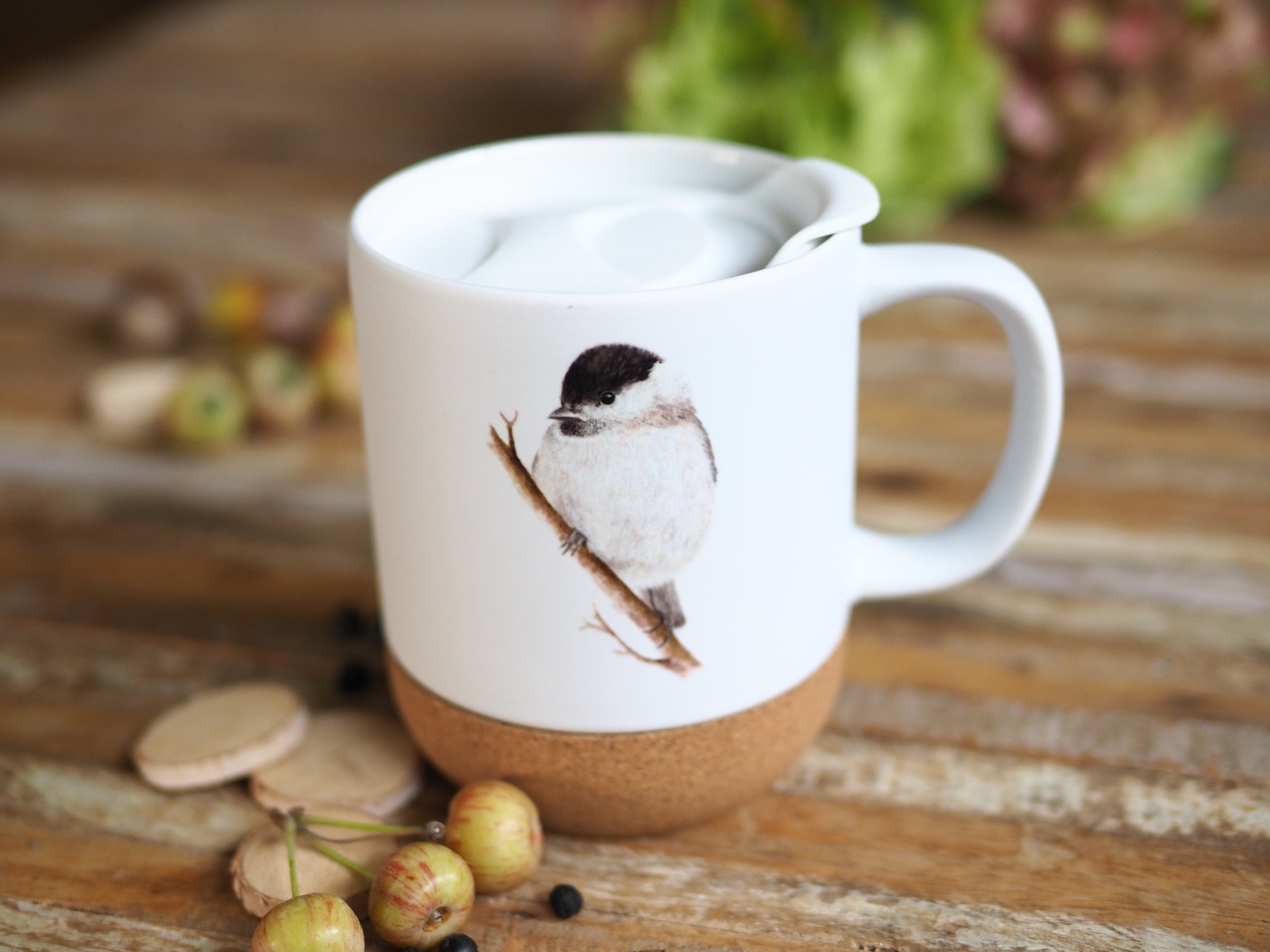 Keramiktasse mit abnehmbarem Korkboden und Deckel, liebevoll bedruckt mit Naturmotiv