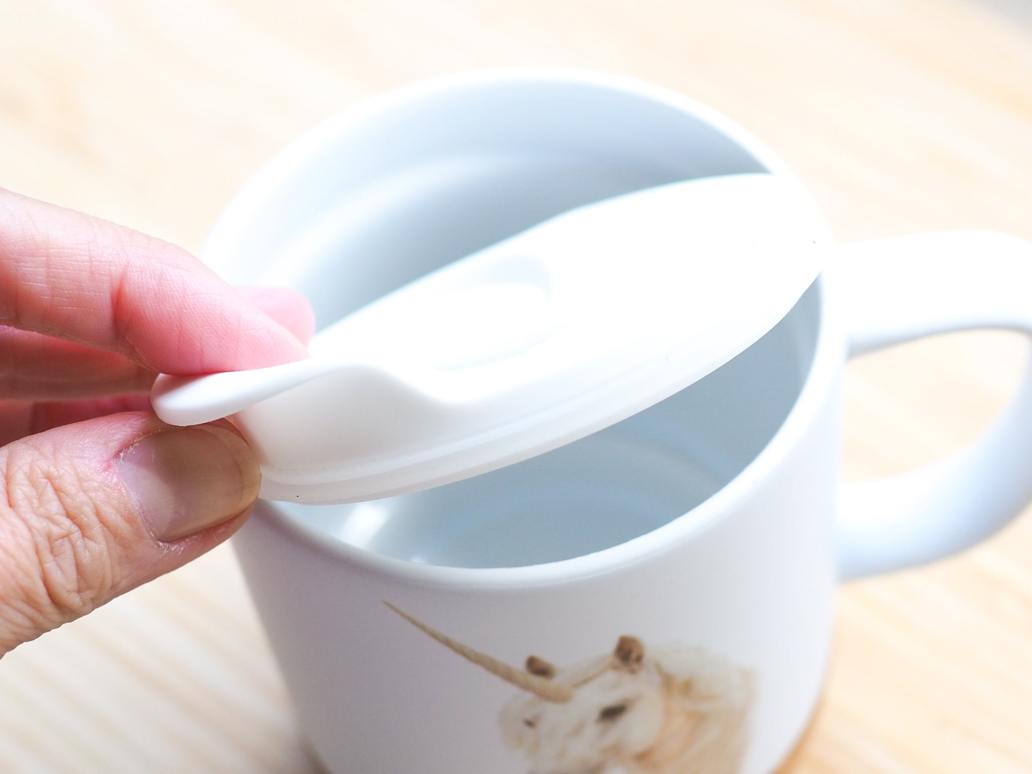 Die Tasse ist beidseitig bedruckt, also perfekt für Links- und Rechtshänder. Bei niedriger Temperatur und pfleglicher Behandlung ist sie spülmaschinengeeignet – Korkboden und Deckel bitte separat reinigen.