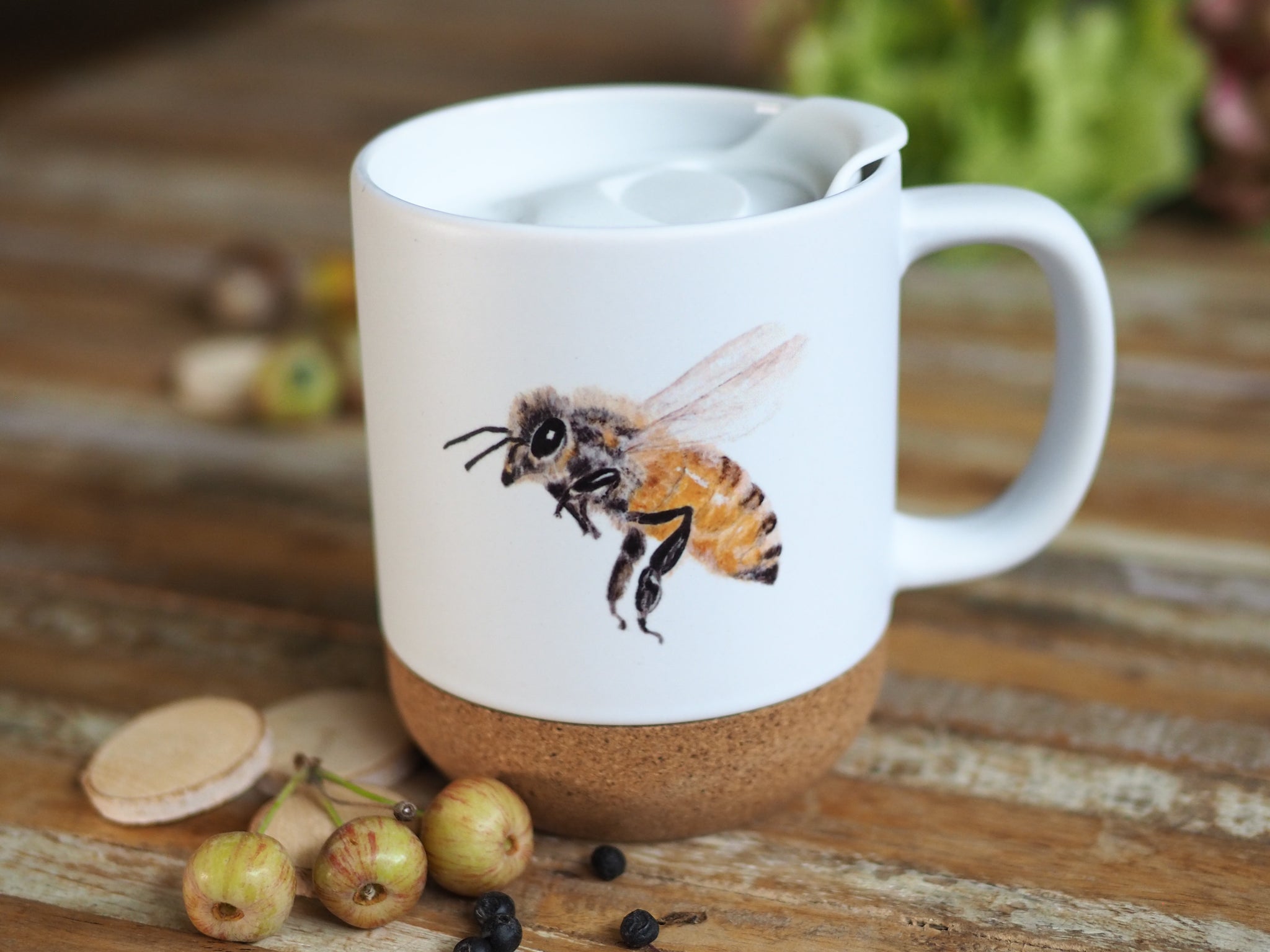 Keramiktasse mit abnehmbarem Korkboden und Deckel, liebevoll bedruckt mit Naturmotiv Biene