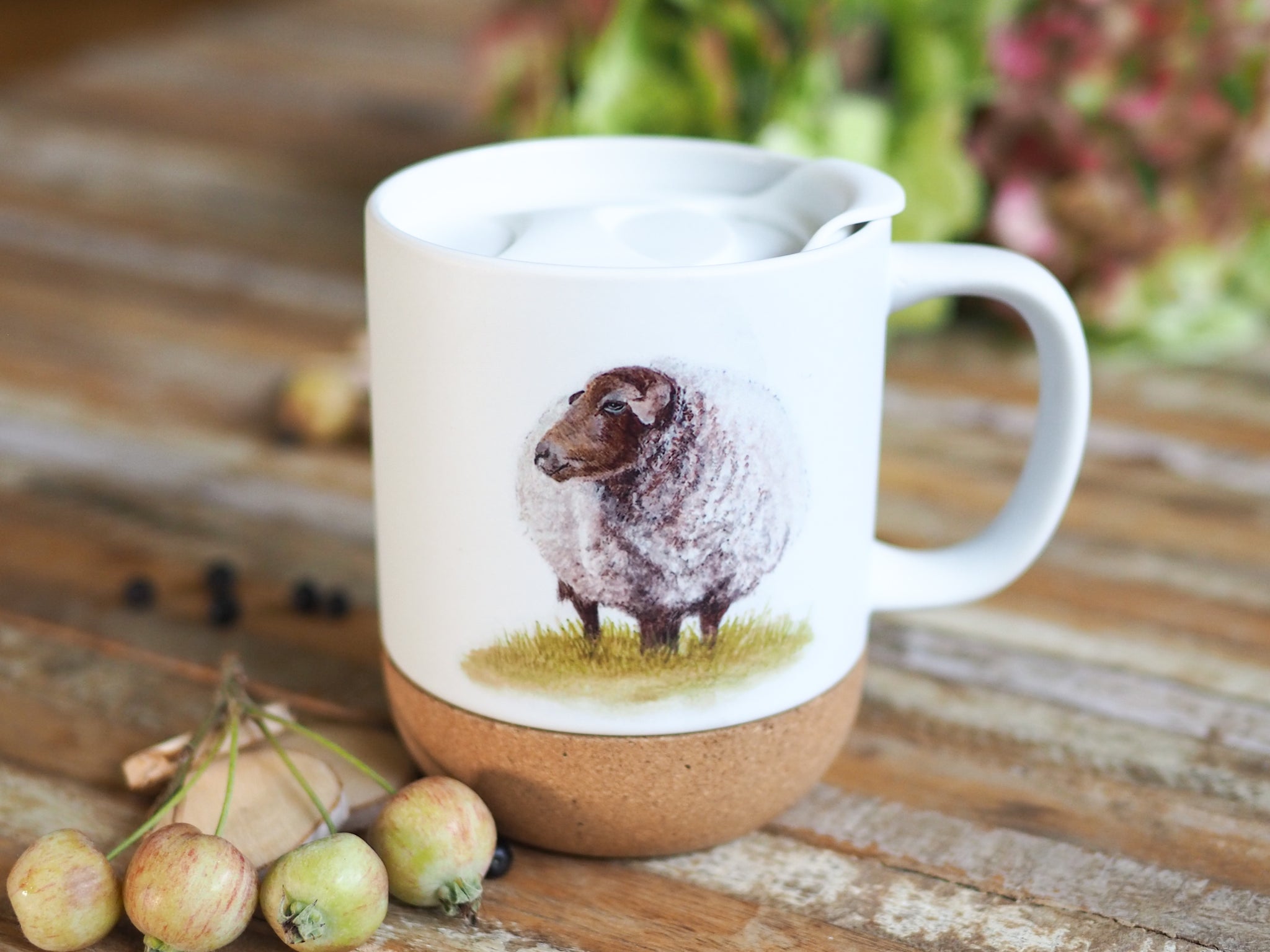 Keramiktasse mit abnehmbarem Korkboden und Deckel, liebevoll bedruckt mit Naturmotiv