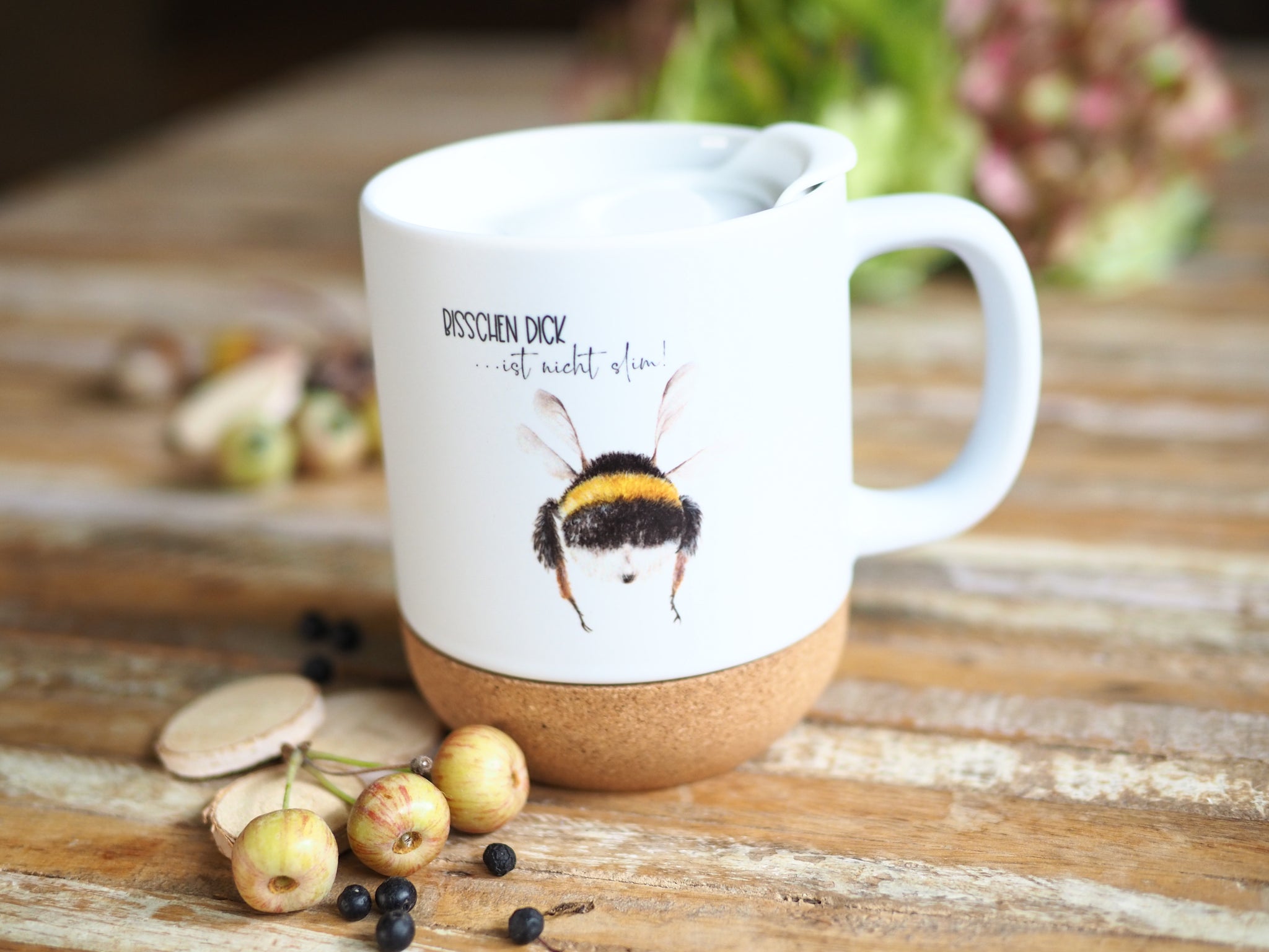 Keramiktasse mit abnehmbarem Korkboden und Deckel, liebevoll bedruckt mit Naturmotiv Hummel