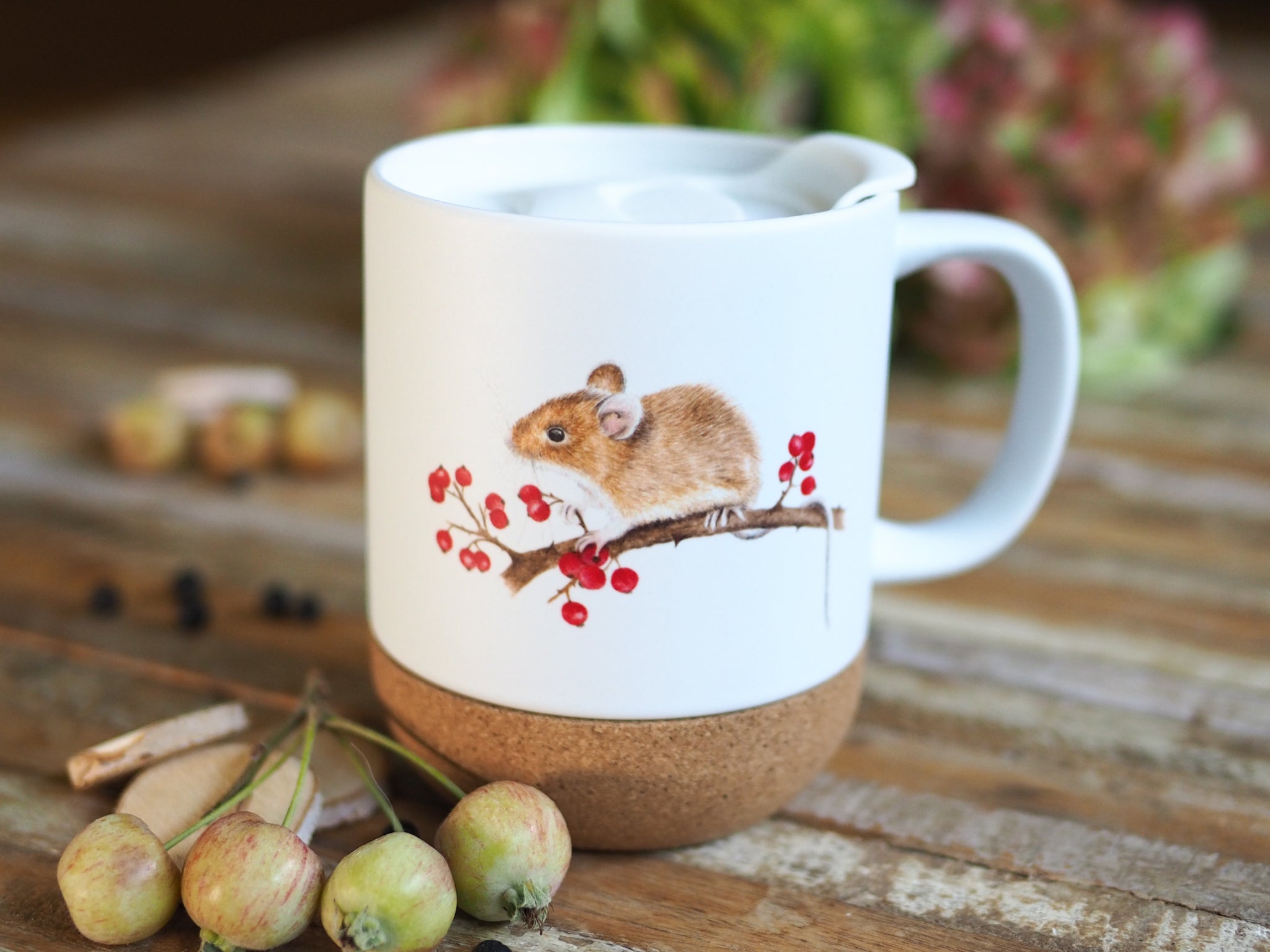 Große Tasse mit Korkboden "Maus mit roten Beeren"