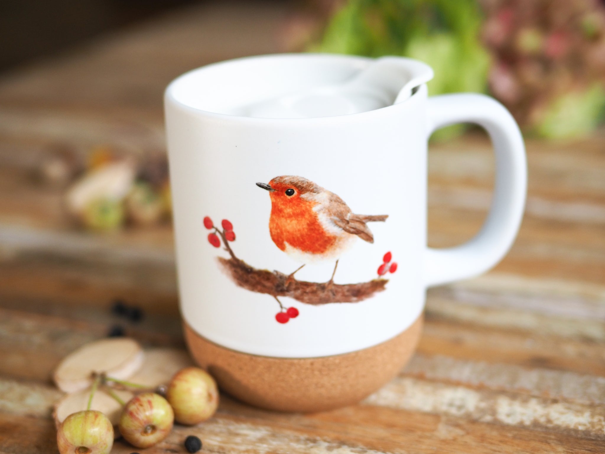 Die Tasse ist beidseitig bedruckt, also perfekt für Links- und Rechtshänder. Bei niedriger Temperatur und pfleglicher Behandlung ist sie spülmaschinengeeignet – Korkboden und Deckel bitte separat reinigen.