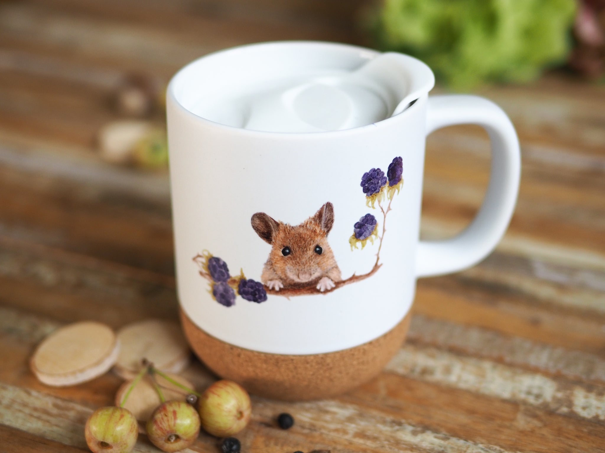 Keramiktasse mit abnehmbarem Korkboden und Deckel, liebevoll bedruckt mit Naturmotiv Maus