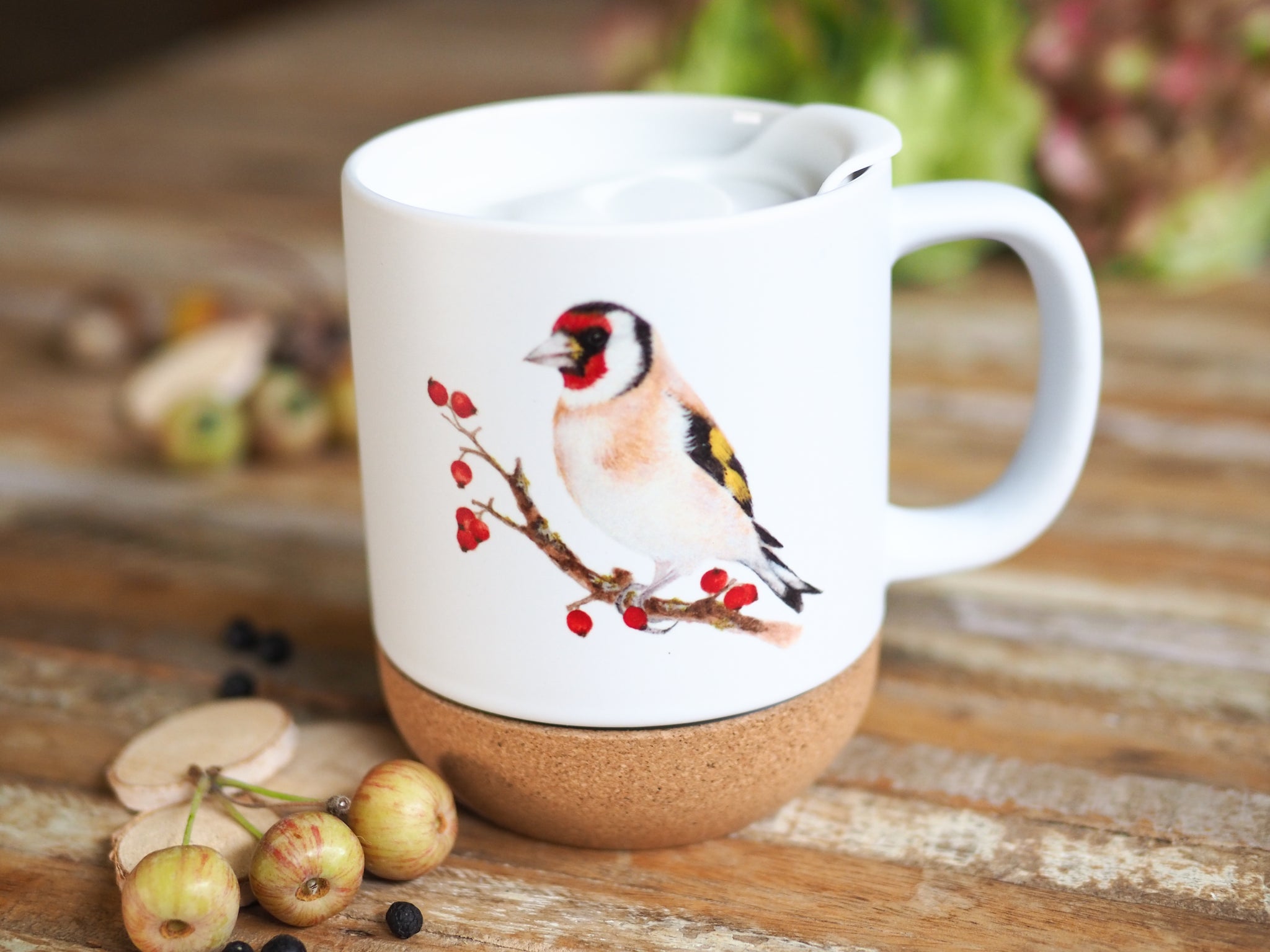 Keramiktasse mit abnehmbarem Korkboden und Deckel, liebevoll bedruckt mit Naturmotiv