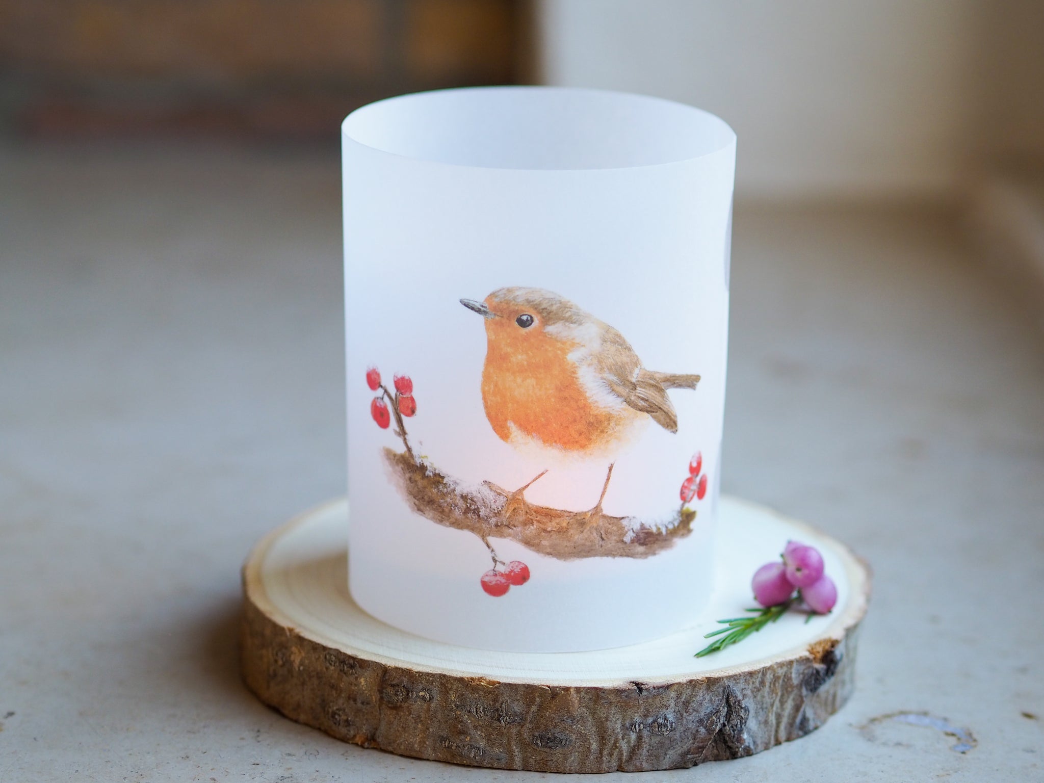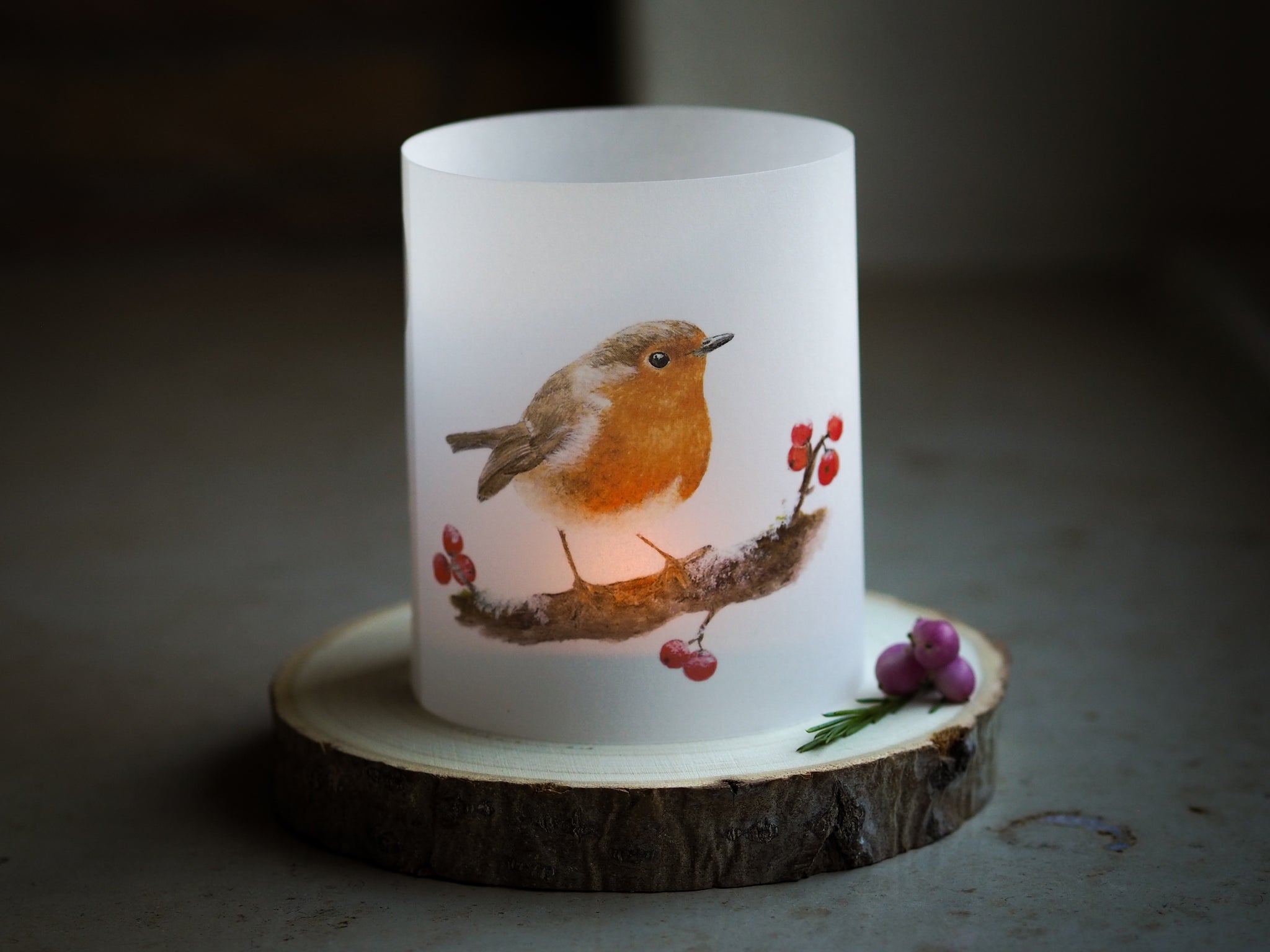 Das schöne Motiv wurde beidseitig auf milchiges Transparentpapier gedruckt. Geschlossen wird es durch einen klartransparenten Sticker, der natürlich dabei ist. Das Teelichtpapier passt um jedes normale Teelicht- oder Marmeladenglas, der Durchmesser beträgt +- 9 cm.